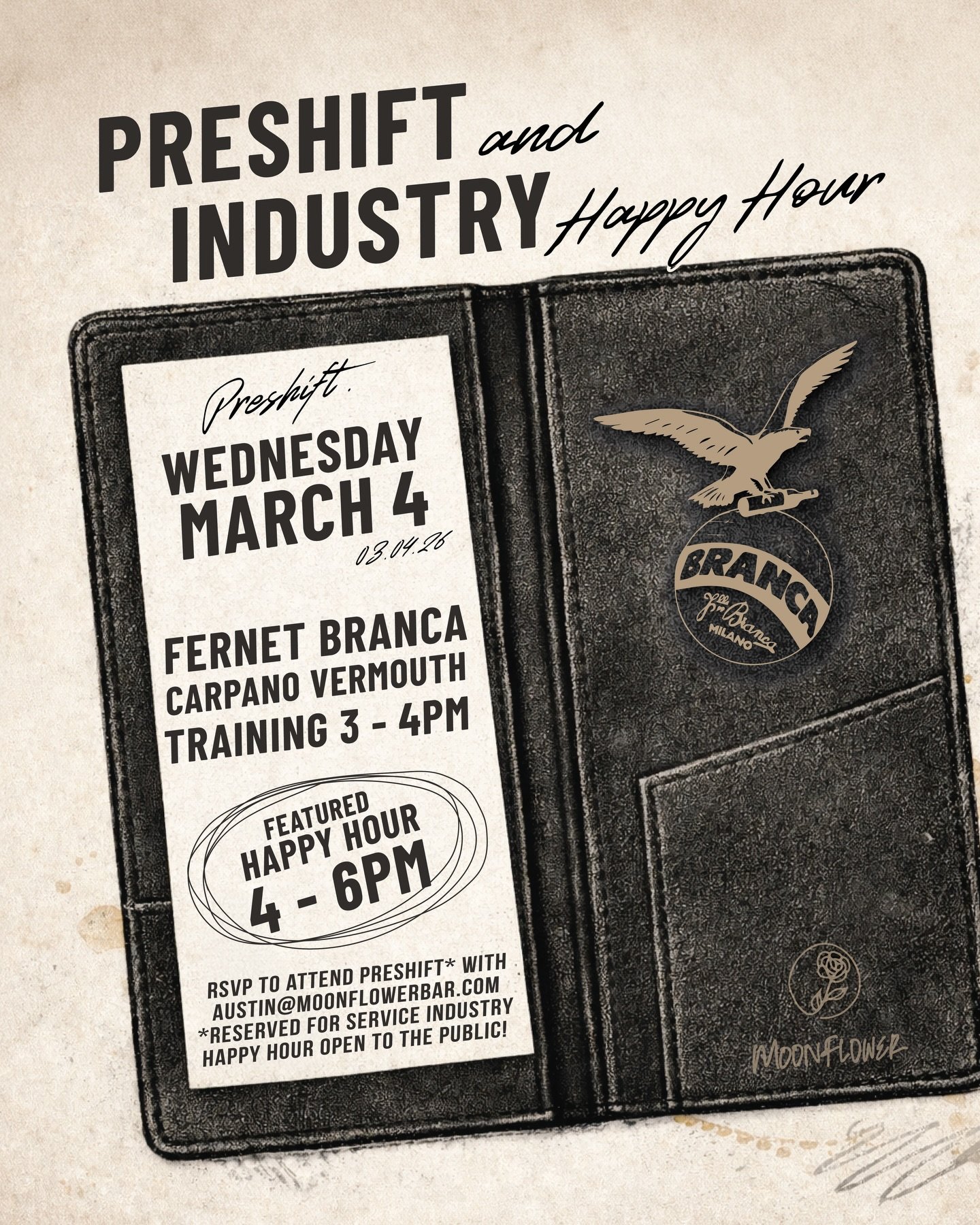 This upcoming Wednesday, March 4. Put it in your calendar and email austin@moonflowerbar.com to sign up for pre-shift.